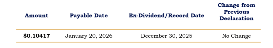 Distribution rates are not performance and are calculated by summing the Trust’s monthly distribution per share over four quarters and dividing by the net asset value or market price per share, as applicable, as of the distribution announcement date. Distributions on common shares are generally paid from net investment income (regular interest and dividends) and may also include capital gains and/or a return of capital. The Trust’s distribution payable on January 20, 2026, includes a short-term capital gain but does not include a long-term capital gain or a return of capital. The specific tax characteristics of the distributions will be reported to the Trust’s common shareholders on Form 1099 after the end of the 2025 calendar year. The final determination for all distributions paid in 2025 will be made in early 2026 and reported to you on Form 1099-DIV. You should not use this notice as a substitute for your 1099-DIV.